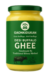 This makkhan is then slow cooked in earthen pots over lighted cow dung cakes for about six hours to produce the golden nectare called Ghee.